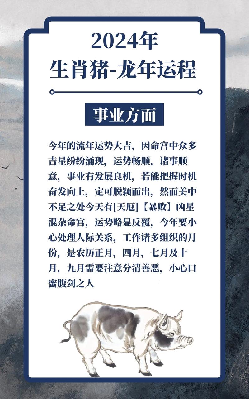 属猪之人一生运势起伏不定,有吉有凶。早年运势平稳,中年前后迎来事业高峰,晚年富足安康。但需注意中年时期,或有波折和变故。