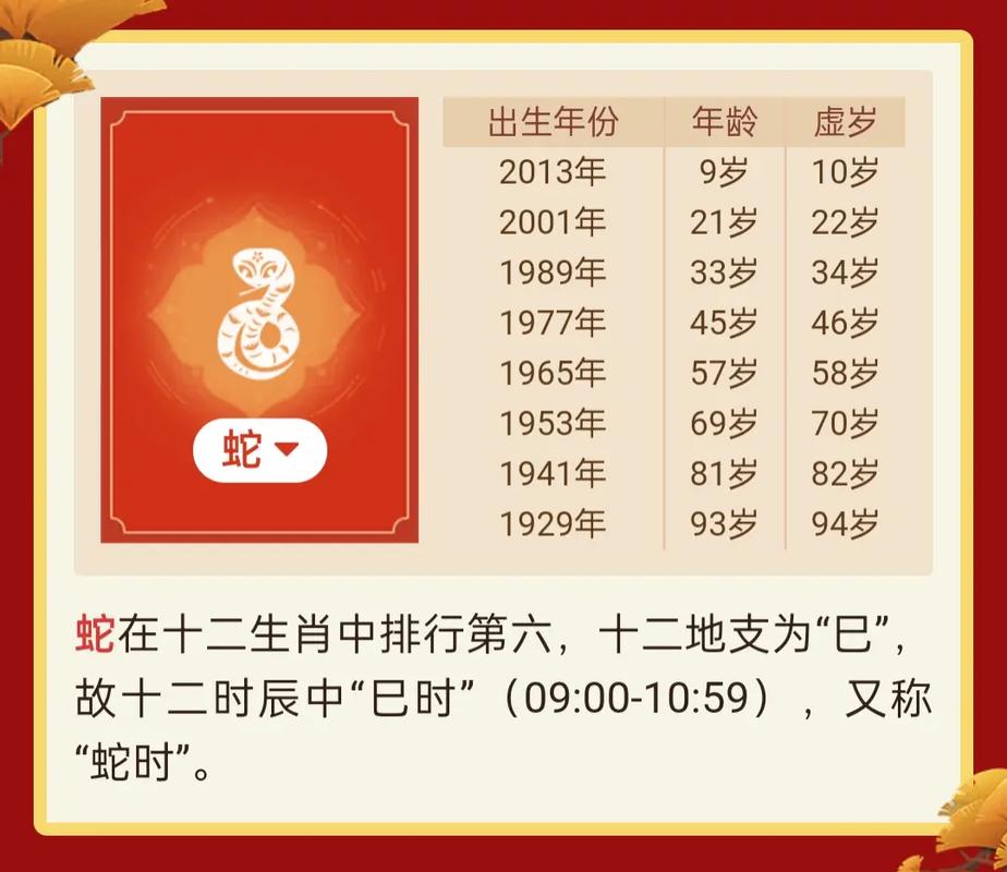 十二生肖:蛇与十二生肖鼠、猴相冲,与十二生肖牛、蛇、鸡相配,所以不同十二生肖出生的人看到蛇的吉凶会有所不同。