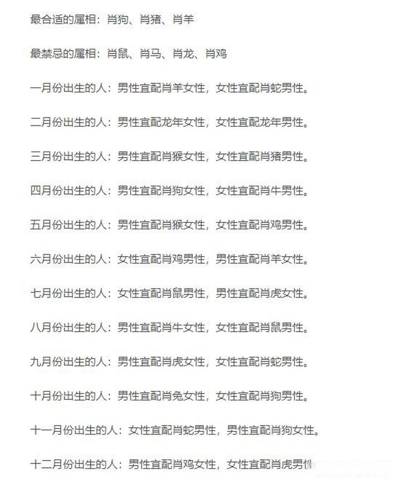 生肖配对:与属羊、属狗、属猪的人较为相合,婚姻生活和谐美满。