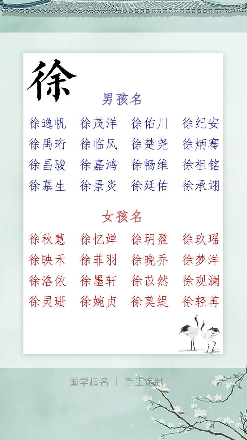 徐姓,作为中国的一个古老姓氏,具有深厚的历史底蕴。徐姓源自黄帝时期,后发展为多个支系。在选择名字时,考虑姓氏的文化背景,可以为名字增添更多的内涵。例如,徐姓在历史上与文化、艺术都有着紧密的联系,因此为姓徐的宝宝起名时,可以结合这些因素,选用一些具有文化气息的字词。
