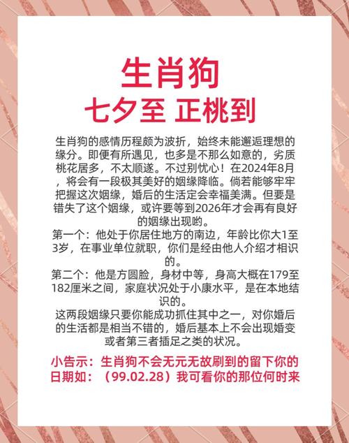 值得注意的是,属狗人的桃花运容易受到流年运势的影响。例如,在某个特定的年份,可能会遇到桃花运旺盛的时期,感情生活丰富多彩;而在另一个年份,则可能面临感情上的挑战,需要谨慎应对。