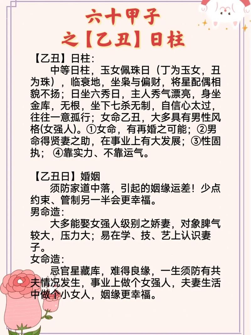 乙丑日柱女命婚姻运势整体较好,正官显露,偏印助力,主婚姻稳定和谐。但也要注意伤官暗藏带来的情感波折,及时调整心态,化解矛盾,维护婚姻幸福。
