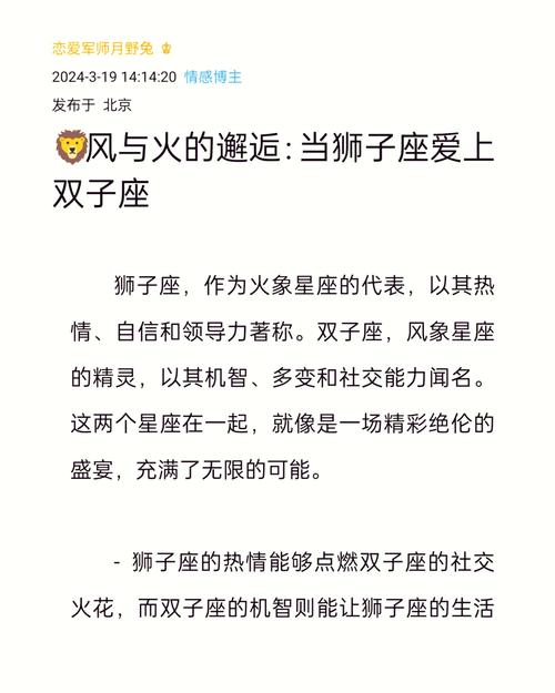 在占星学的世界里,升星座与太阳星座的组合常常被认为是性格和人际关系的关键。狮子座作为一个充满自信和活力的星座,与灵活多变的双子座结合,注定会产生一场精彩绝伦的星座盛宴。这两者之间的关系充满了激情、乐趣与挑战,让我们一起深入探索这个奇妙的组合。
