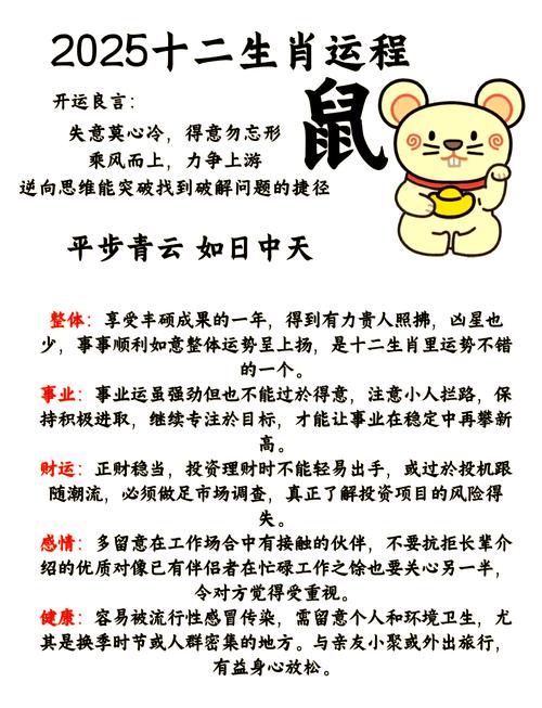 2025年将是老鼠男人充满挑战和机遇的一年。通过科学的规划和积极的反应,我们可以在事业、财富、感情和健康方面取得良好的成绩。我希望本文的详细分析能帮助老鼠男人更好地把握今年的财富,迎接未来的美好生活。