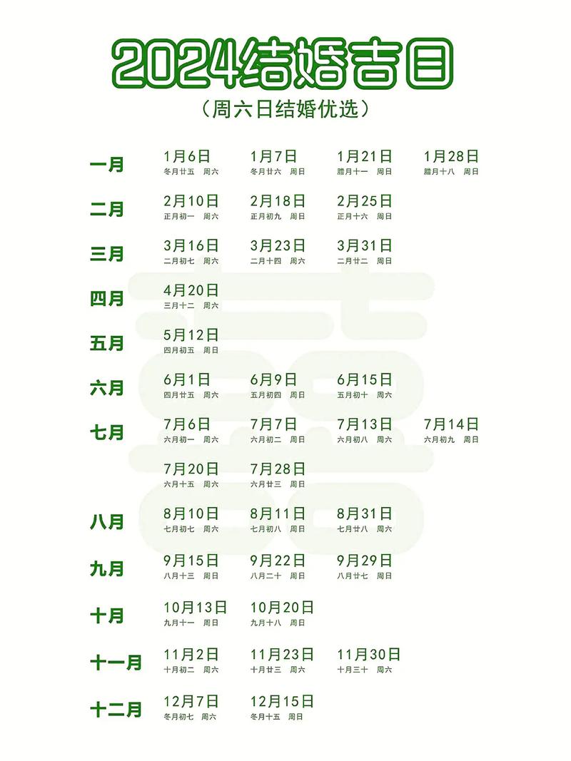 2024年伊始,喜气盈盈,良辰吉日频现,为新人缔结良缘提供了诸多选择。以下罗列部分2024年适合嫁娶的吉日,供有情人参考: