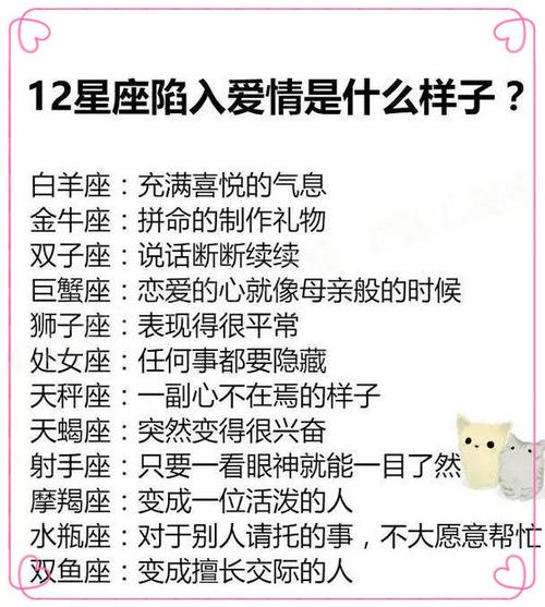 白羊座白羊座的人热情洋溢,喜欢追求新鲜感和刺激感。他们在爱情中也是如此。他们倾向于热情冲动地表达自己的感受。他们喜欢有自己的想法和行动计划,不喜欢被束缚和控制。在爱情中,他们需要一个能够与他们分享生活和激情却无法控制自己的人。