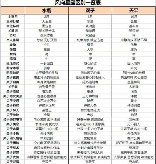 象征冬天,重智慧与沟通,他们喜欢外出交际,认识很多人,这种能力又在众人围绕中增长。他们谈笑风生、容易相处,所以跟各种类型的人都相处得很好。他们很少抱怨,只会说“消除隔阂”,然后将不开心的事情忘掉。风象星座能与别人结成很亲密的关系,所以往往能够交到一辈子的好朋友星座。