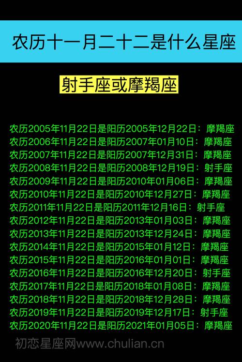 你好,星座是按阳历计算的,腊月二十二是无法判断的,你要说清楚是哪一年腊月二十二,才能用阳历计算出相应的星座。根据阳历分布的星座日期如下:白羊座3月21日~4月19日4月20日金牛座~5月20日,双子座5月21日~6月21日,巨蟹座6月22日~7月22日,狮子座7月23日~8月22日,处女座8月23日~9月22日9月23日天秤座~10月22日,天蝎座10月23日~11月22日,射手座11月23日~12月21日,摩羯座12月22日~1月19日,水瓶座1月20日~2月18日,双鱼座2月19日~3月20日