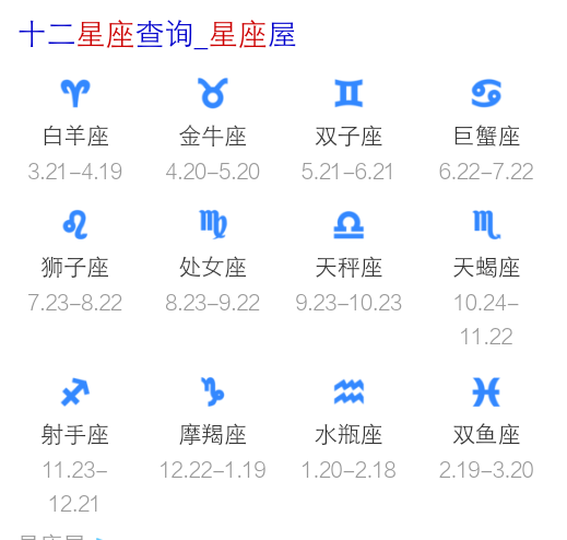 星座名,星座英文名,星座日期,星座属性,幸运数字,辛苦的颜色,
