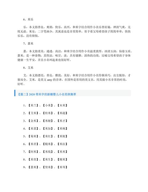 1、米扬。米:五行:水。部首:米字旁,汉字拆分:丷,木,米。稻米、大米、米粮川意指丰衣足食、小巧玲珑、坚毅不拔。一般指稻米,引申为丰收。用作人名意指财富、可爱、坚强之义;