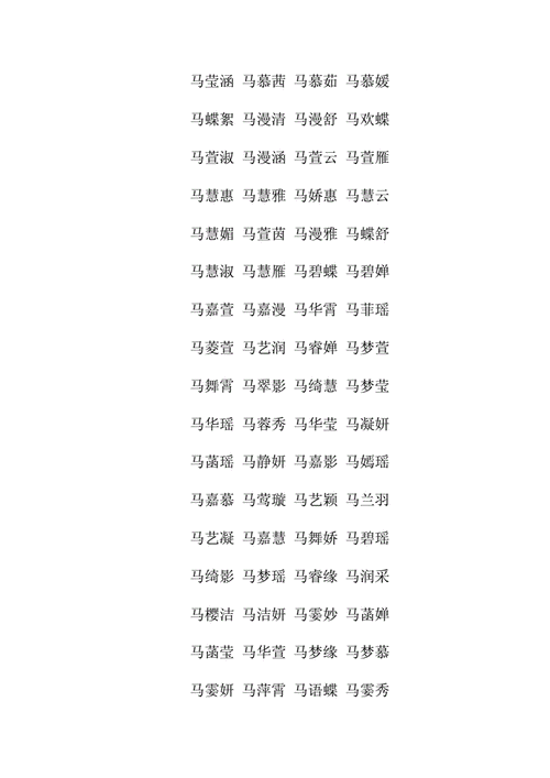1、马馨娅、马蓝子、马诺初、马婉彤、马儿瑶、马琪熙、马亦语、马芳娅、马亭昕、马乐念、马媛虹、马婉婉、马黛柏、马真燕、马韵妍、马桐语、马亦舒、马舞云、马双迎、马艺璐、马庆君、马亭琳、马冰韵、马瑛葵、马雅艳、马玉舒。