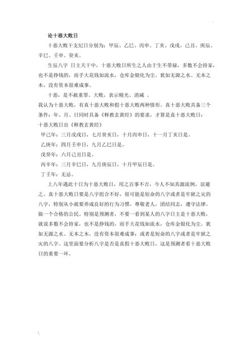 二、十恶大败日的危害是什么?禄是工资,也就是国家给的工资。禄旺者工资多,禄弱者工资少,禄空者没有工资,也就是赚不到国家的钱,而十恶大败恰恰是禄逢空亡。所以,生于十恶大败之日的人,对金钱看得很淡,赚钱很难,却像流水一样花钱。他们不会理财,只会失去家庭。除非八字中还有其他能镇住凶神的神贵人(如日、月德贵人),否则一定会毁了他们的一生。