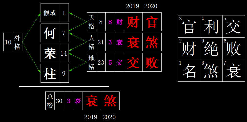 九宫名学数字吉凶的基本原理九宫名字学数字吉凶的基本原理是利用汉字中的“九宫”图形将每个汉字分为“九芒星”,其中五芒星为阳,四芒星为阴,运势根据一个人的出生日期、拼音的声母及其汉语拼音计算。因此,可以确定其性格、运气、财富、学业、择婚、子女等属于一个人前后三个月至七年的财富。