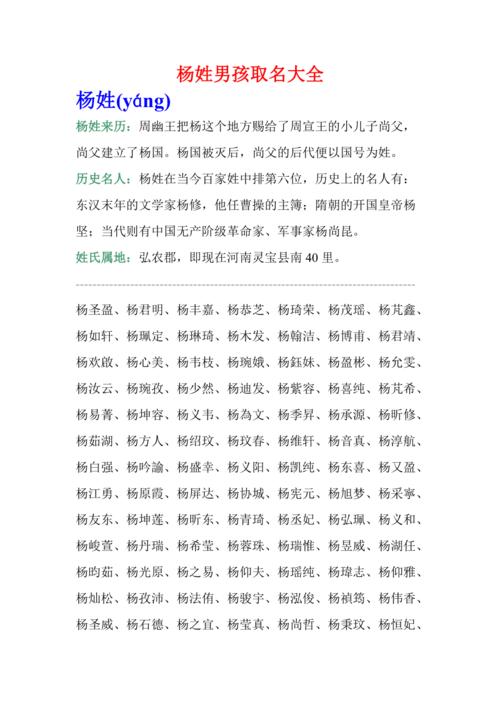 杨姓的来源有几种不同的说法,但最广泛认可的说法是与夏朝大臣杨云有关,因此杨姓也被视为具有文化遗产的姓氏。在宋代的《百姓》中,杨姓的拼音是Yáng,它意味着阳光,具有阳刚和积极的意义。在南方方言中,杨姓的发音是Yeung或Yang,具有独特的风味。因此,在命名杨姓时,可以根据个人喜好和家庭遗产进行选择。