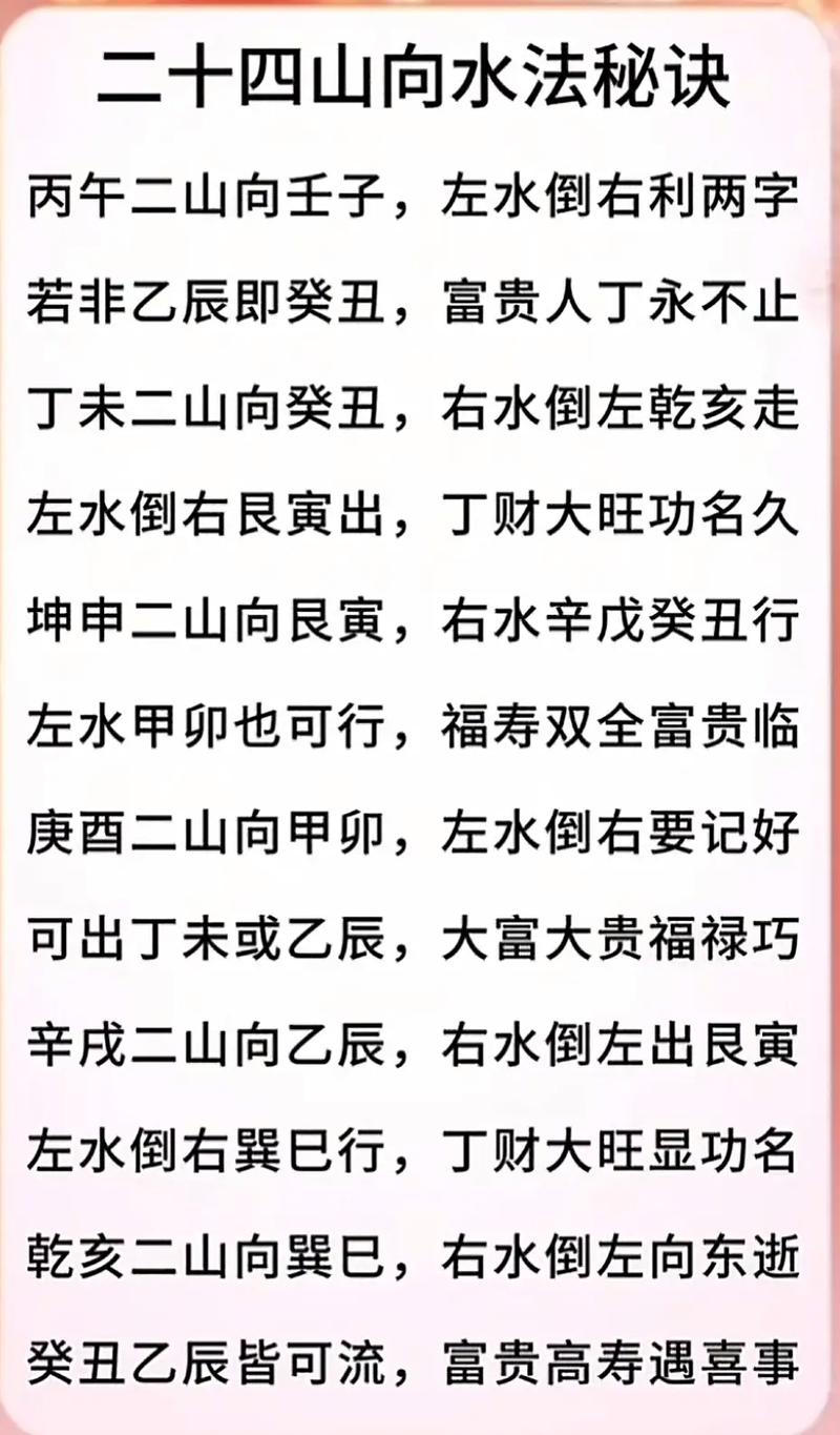 风水公式是古代风水学家总结的经验,是运用风水理论的简单方法。以下是一些常用的风水公式,帮助我们更好地应用阳宅24山的风水知识: