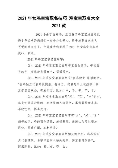 鸡年出生的孩子是父母最关心的问题。根据传统文化,鸡年属于“金鸡”,象征着勤奋、灵巧和机智,也预示着未来“金榜”的好运。那么,如何给鸡年出生的宝宝取个好名字,让他/她得到更多的好运呢?以下是一些命名技巧,希望对家长有所帮助。