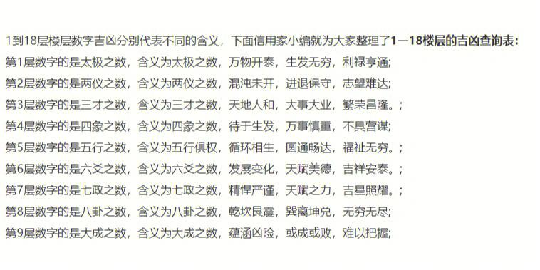 根据数字大小来判断楼号的吉凶。一般来说,数字越大,代表着越吉利。但是有的数字不能超过一定的范围,比如“4”和“13”等数字,这些数字在中国文化中被视为不吉利的数字,所以如果楼号数字里带有这些数字,就会降低楼号的吉祥程度。