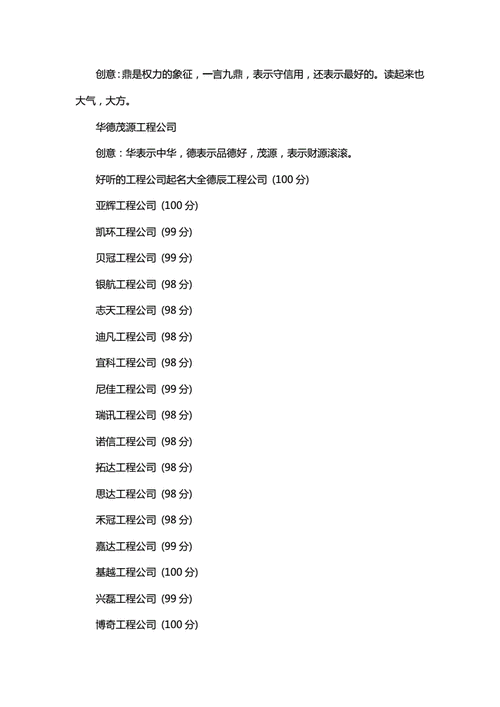 工程公司名称推荐:[华汉工程有限公司]华:繁荣;广阔:广阔;广阔:意味着公司的发展前景。[明东工程有限公司]铭记:记住;东:东升;明东,东方:意味着公司可以知道,太阳升起。[金悦工程有限公司]金:金钱;悦:快乐;金悦:意味着公司未来有足够的钱,公司的发展也非常愉快。