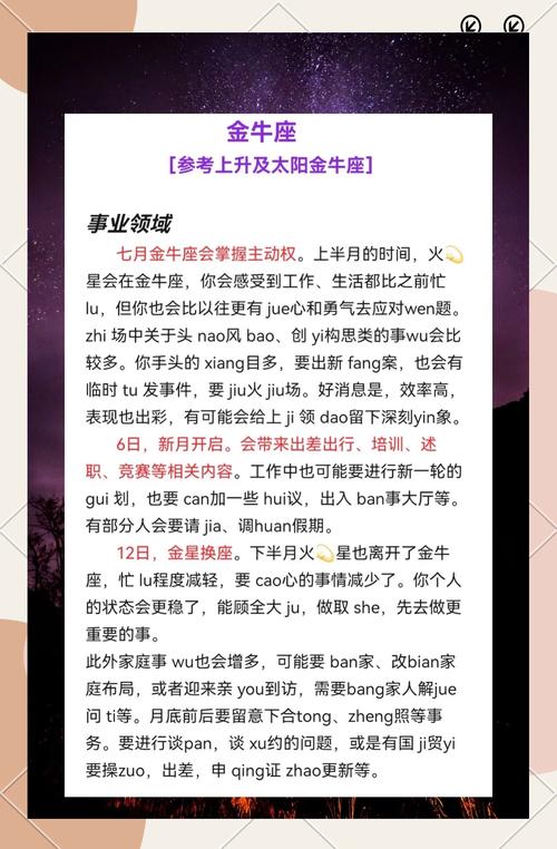 2025年7月,金牛座的朋友们将迎来一系列的变化和挑战。以下是对他们在事业、财运、感情和健康方面的详细分析。