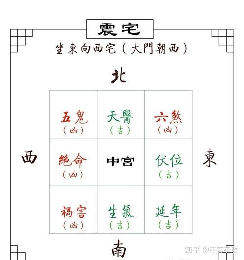 坐东朝西的房屋(震宅):五行属木。西方兑卦为吉,东方震卦为凶。