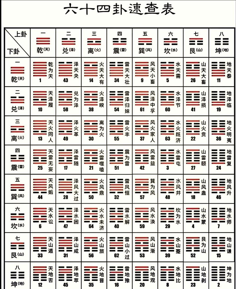 6. 确定卦名:根据所得的六爻组合,对照易经的六十四卦,确定所得到的卦名。