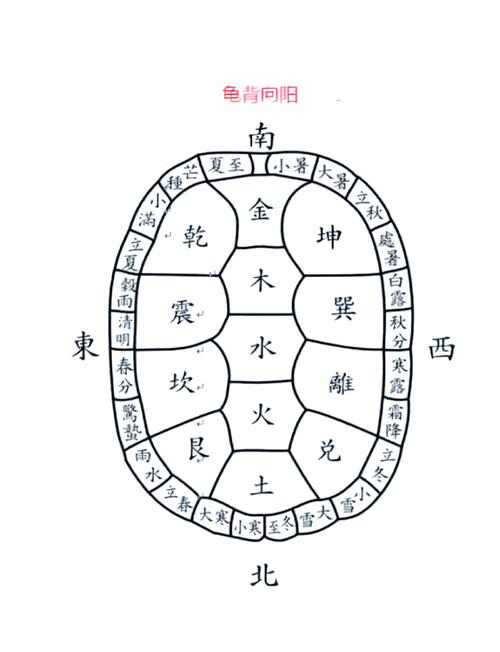 天、地、人三才的对应:龟壳的背部有龟纹,中央有三格分别代表天、地、人三才;周围有24格代表二十四山,二十四节气;底部有12格代表十二地支。这种结构与八卦的天地人、三才以及占卜理论中的天干地支相对应,使得龟壳在摇卦中成为了一种重要工具。