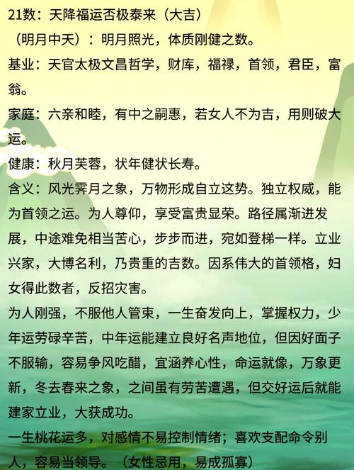 2.吉星的优势:吉数所在的格位,以及吉数的具体含义,则能起到一定的弥补作用。如果人格、总格为大吉之数,能够压制凶星的影响,那么即使存在“吉中带凶”的情况,整体运势依然偏向积极。例如,人格为“21”(明月中天),总格为“31”(春日花开),即使地格存在凶数,也能凭借自身的能力和机遇,克服困难,取得成功。