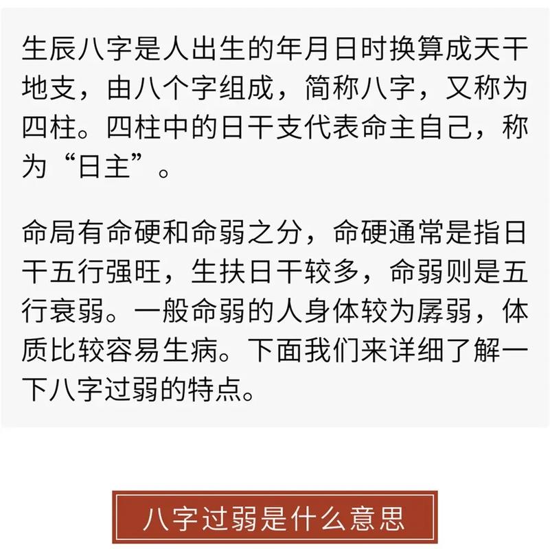 “八字过弱”是命理学中一个重要的概念,它并非简单地指身体虚弱,而是指个体出生时辰所对应的生辰八字中,代表自身的“日主”力量相对薄弱,难以承受其他五行力量的影响。理解“八字过弱”需要深入探讨八字命理的构成、日主强弱的判断标准,以及对个体命运可能产生的影响,并探讨相应的应对策略。