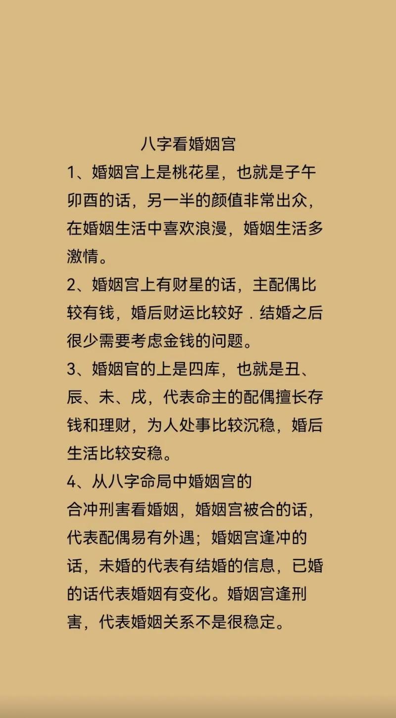 婚姻宫,在八字命理中通常指的是一个人命盘中的配偶宫,它与个人的婚姻状况、配偶性格、婚姻运势等密切相关。通过分析婚姻宫的位置和组合,可以对一个人的婚姻生活做出一定的预测。每个人的婚姻宫都有其特定的属性和影响力,这种影响力在一定程度上决定了个人在婚姻中的体验和生活质量。