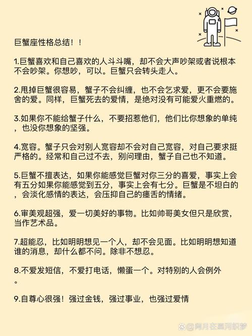 正是这些特点,构成了巨蟹座复杂而细腻的情感世界。理解这些特点,是克制情感的第一步。
