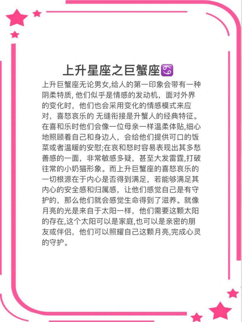 巨蟹座,作为黄道十二宫中最具情感和直觉的星座之一,女性往往被视为温柔、敏感而又富有母性光辉的存在。她们的内心世界如同深邃的海洋,充满了丰富的情感和细腻的感受。当我们将巨蟹座女性与她们的上升星座结合在一起时,会发现这种星座的交织为她们的性格增添了层次感,形成了独特的个性魅力。