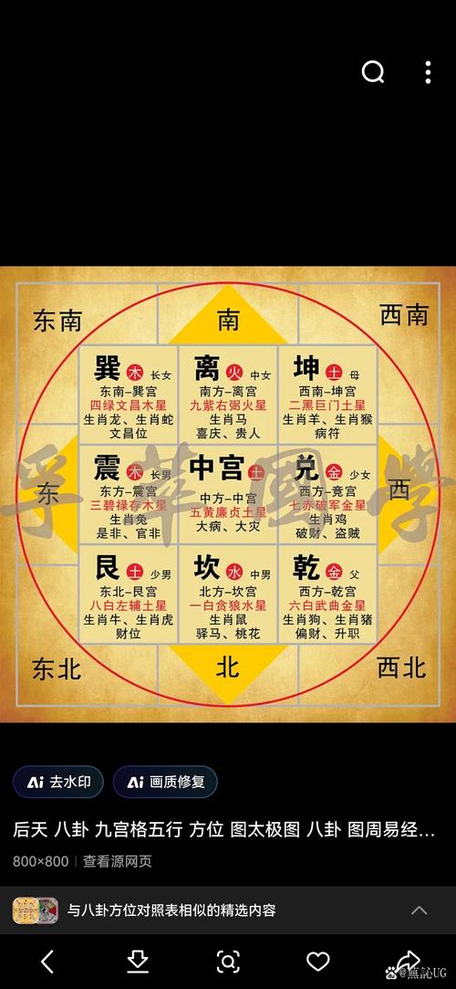 3.方位:八卦对应着不同的方位,例如乾位于西北方,坤位于西南方,震位于东方等等。方位可以用于判断风水的好坏,从而影响人的运势。