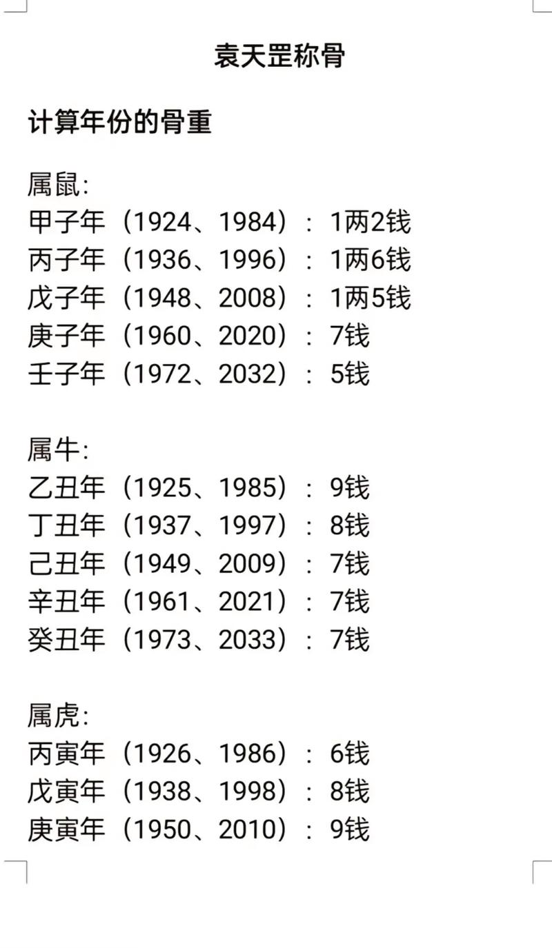 “几斤几两”的说法,主要来源于一种称为“称骨算命”的方法。相传称骨算命是由唐朝袁天罡所创,将每个年份、月份、日期、时辰都赋予一个固定的重量值,然后将这些重量值相加,得到一个总重量,即为“几斤几两”。根据这个总重量,对应一份命书,从而推断命运。