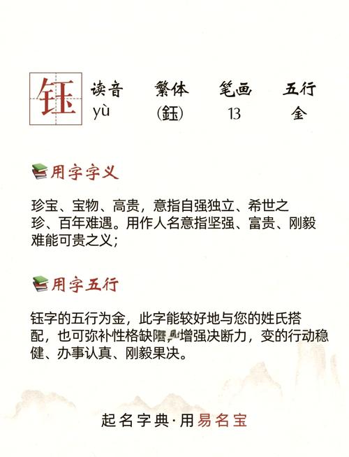 在为男宝宝起名时,父母无不寄予厚望,希望名字能够蕴含美好寓意,助力孩子未来发展。其中,“钰”字因其美好的象征意义,广受父母喜爱。本文将聚焦于带“钰”字的男宝宝名字,从字义、音韵、以及文化内涵等多个维度进行深度剖析,力求为父母提供专业且精准的起名参考。