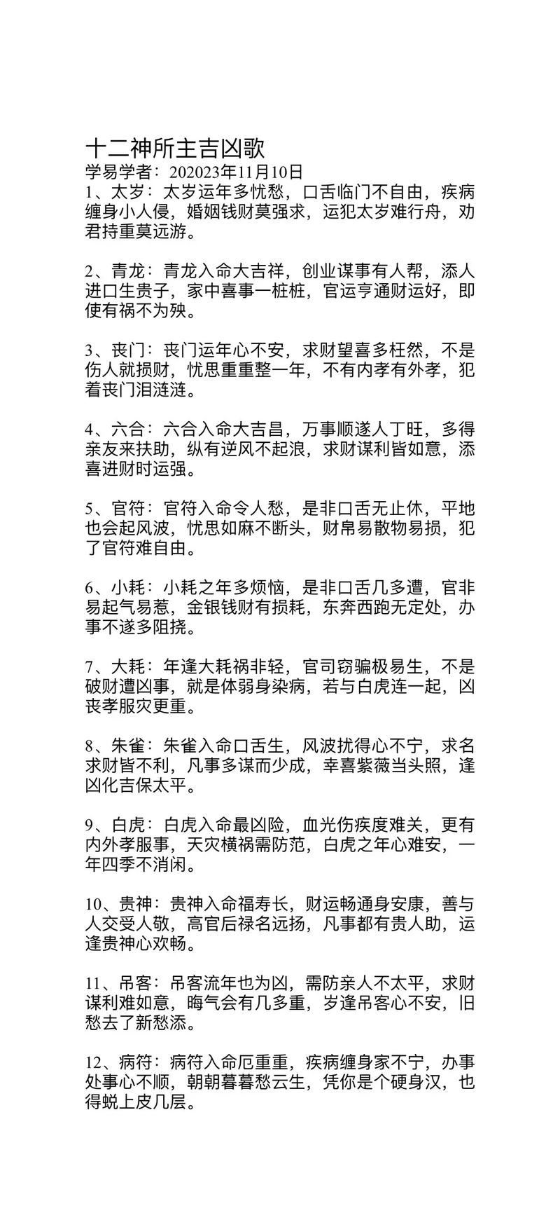 十二神押运吉凶歌不仅是一种传统文化的体现,更是古人智慧的结晶。在纷繁复杂的现代生活中,重新认识和运用这些古老的智慧,能够帮助我们更好地理解自我,掌握命运。无论是在个人发展、家庭和谐还是职业选择中,了解和应用十二神的理念,必将为我们带来更多的启示与帮助。