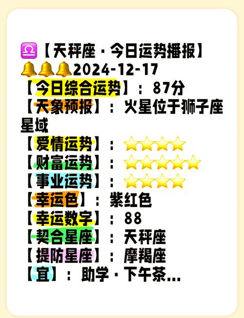 今日的天秤座运势,宛如宇宙中的一场精彩剧目。无论是事业上的挑战还是人际关系中的波动,都可以通过冷静的态度和合理的策略来应对。以积极的心态迎接每一个挑战,将会使你在今天的星象影响下收获丰盈的成果。记住,你拥有足够的智慧和能力来驾驭这一天的各种变化,勇敢迈出每一步,成功就在前方等着你。