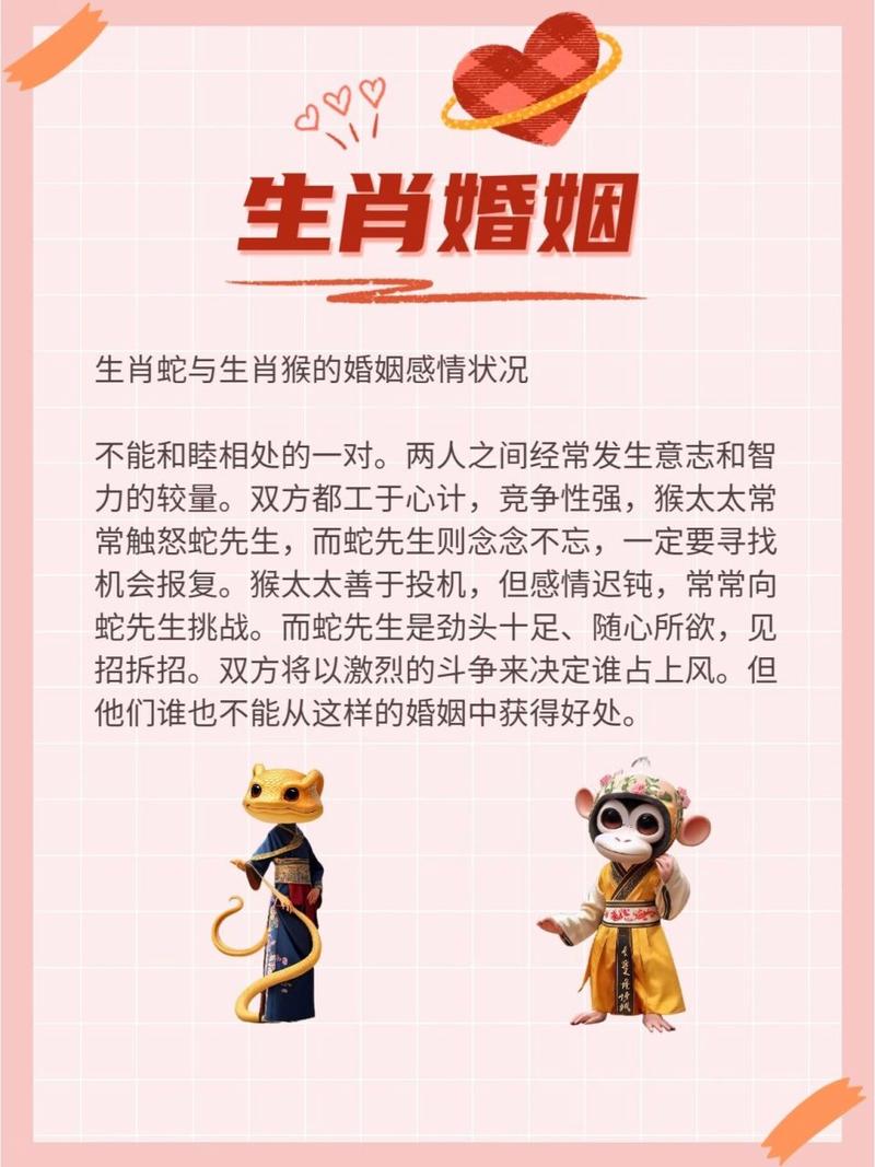 生活态度: 属猴女可能更注重享受当下的快乐,喜欢追求刺激和新鲜感。属蛇男则更注重长远规划,喜欢稳定和安全感。如果双方不能达成共识,容易在生活方式的选择上产生分歧。比如,属猴女可能会倾向于选择一份充满挑战但收入不稳定的工作,而属蛇男则会希望她选择一份稳定安逸的工作。