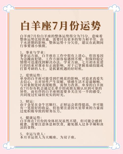 7月17日前后:感情运势佳,单身白羊有望邂逅心仪对象。已婚者与伴侣关系和谐,可享受甜蜜时光。