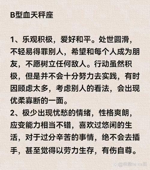 B型血的特点是富有个性、自由奔放和极具创意。B型血的天秤座女性通常充满活力,善于交际,但也可能表现出一定的自我中心和情感波动。她们在婚姻中追求的是激情与创新,而不是单调的稳定性。