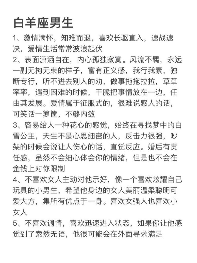 在爱情方面,白羊座男性同样展现出他们的热情和直接。他们喜欢主动追求,一旦爱上一个人,就会毫不掩饰地表达自己的爱意。他们的爱是热烈的、奔放的,充满了激情。他们会竭尽所能地让对方感受到他们的爱意,也会尽力满足对方的需求。白羊座男性的爱情也常常带有冲动性,他们可能会在没有充分了解对方的情况下就迅速陷入爱河。白羊座男性需要学会理性看待爱情,避免因一时冲动而做出错误的决定。
