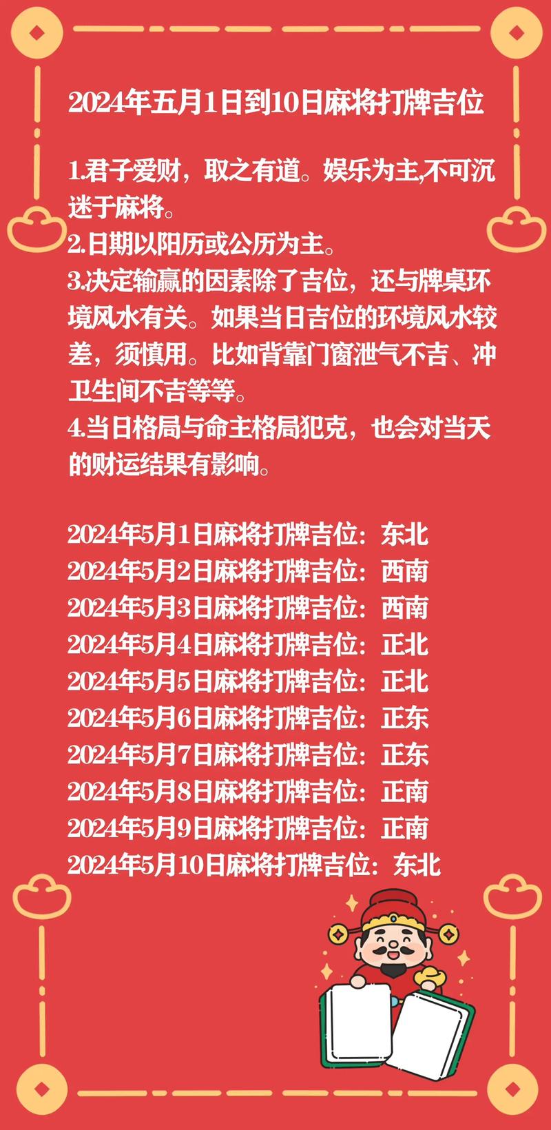 掌握白羊座今日打麻将的财神方位,可以有效提升财运,但切记理性对待,适度娱乐。祝白羊座的朋友们今天麻运亨通,财源广进!