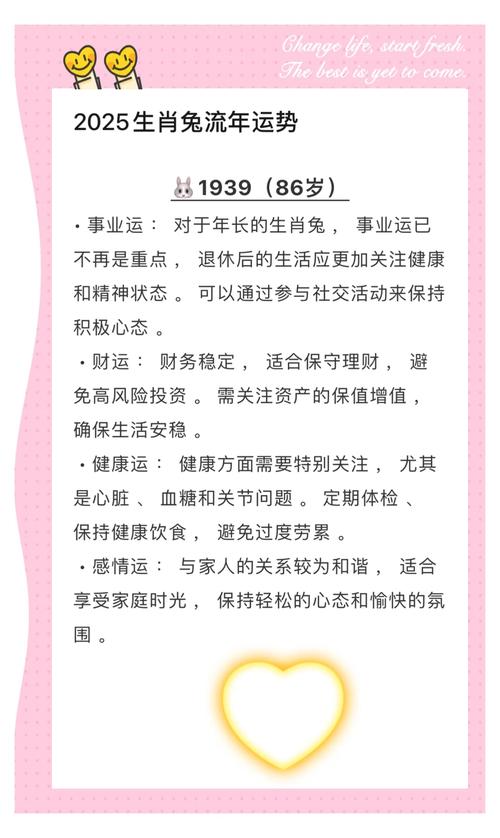 进入2025年,属兔人冲太岁,运势稍有波折。整体上宜静不宜动,稳健为上。工作上需谨言慎行,感情上避免冲动,财运方面保守理财。
