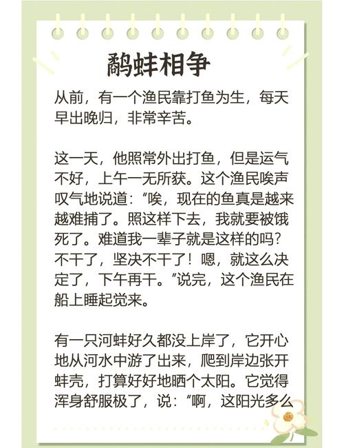 “鹤蛤之间的斗争”最早出现在战国政策中,讲述了鹤蛤之间的斗争。鹤试图捕食蛤蜊,蛤蜊为了生存而反击。最后,两人都不幸地成为了渔民获利的第三方猎物。这个故事深刻地反映了战斗的无意义和不可预测的后果。