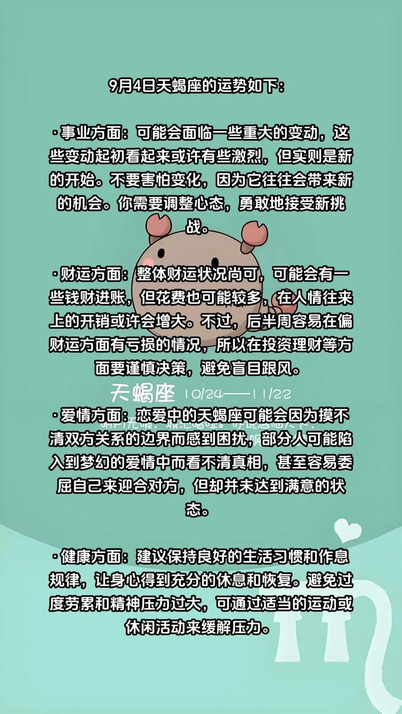希望你能充分利用这些运势信息,让9月4日成为你迈向更高目标的起点。无论遇到什么困难,保持冷静和积极的态度,将帮助你在这一天中充分发挥天蝎座的独特优势。