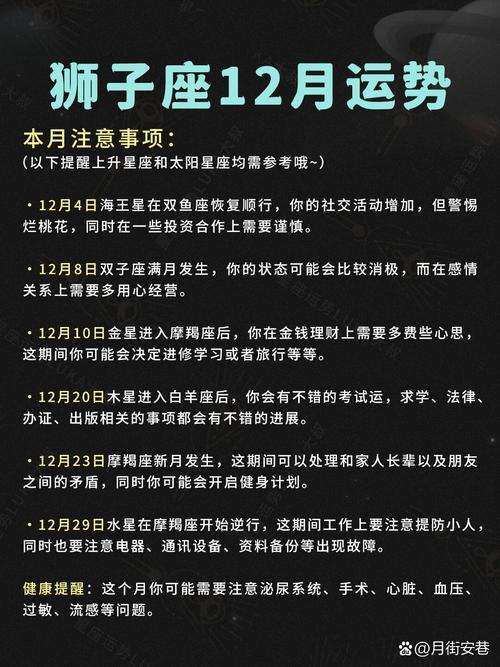 12月,星空为狮子座编织了一场别开生面的星际秀。这不仅是狮子座年度的尾声,更是一个在荣耀与挑战之间翩翩起舞的时节。无论你是渴望突破的事业先锋,还是希望在情感上找到契机的浪漫主义者,这个月的星象变化都将对你产生深远的影响。让我们一探究竟,这个月狮子座将如何在星辰的指引下,迎接一场充满惊喜的运势之旅。