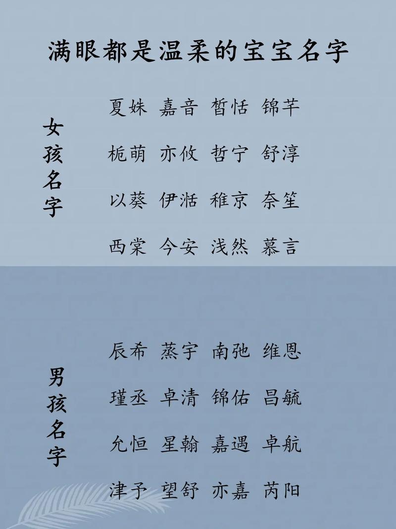 男孩:志成(志向高远)、致远(前程似锦)、明德(贤明品德)、浩然(浩气长存)、天鹅(展翅高飞)