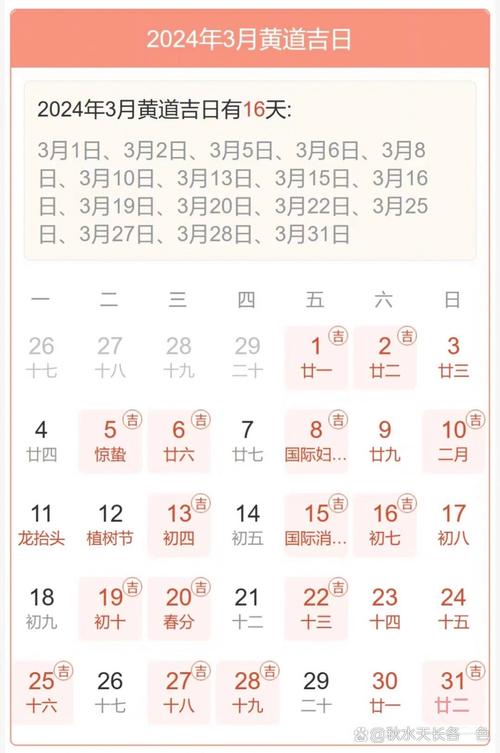 综合考虑:除了吉日外,还应考虑实际情况,如天气、交通等因素,综合考虑后做出合理选择。