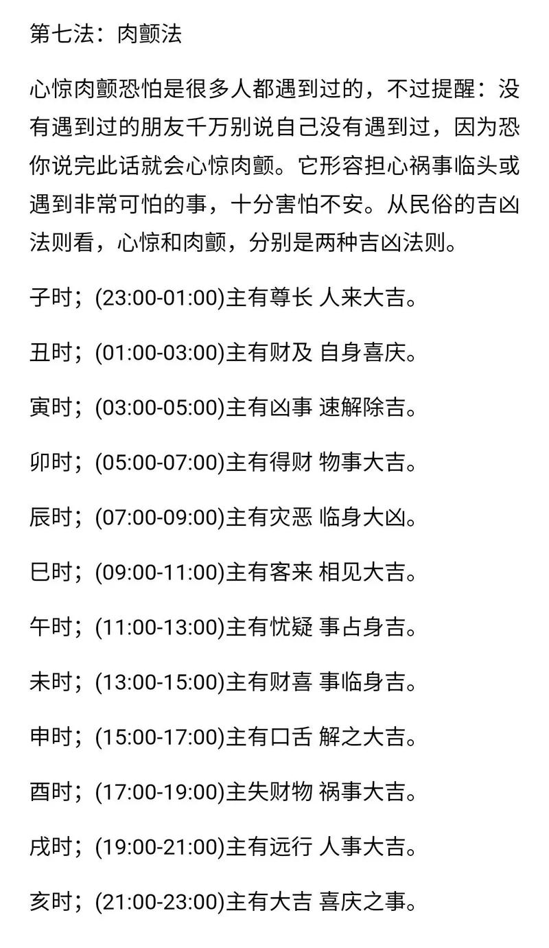 巳时肉颤法是一种基于传统文化的一种占卜术,可以为我们提供一些吉凶预兆。虽然肉颤法的准确性存在一定的局限性,但若能结合个人实际情况谨慎解读,不失为一种有趣的体验和心理慰藉。