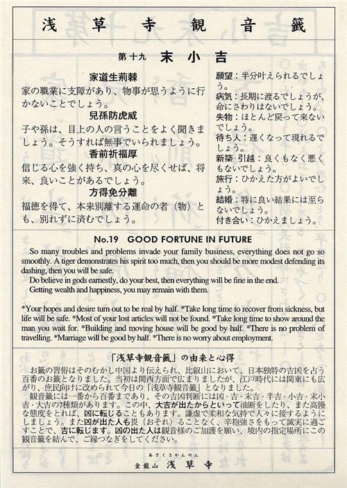 观音灵签第十九签是吉祥签,预示着一切顺利。只要我们保持积极乐观的态度,努力工作,我们就能迎来一个幸福美好的未来。