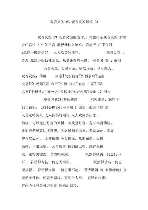 观音灵签第23签包含了深刻的哲学和智慧,为我们提供了面对生活变化的指导。如果我们能理解它的真正意义,我们就可以轻松地生活在风暴的变化中。